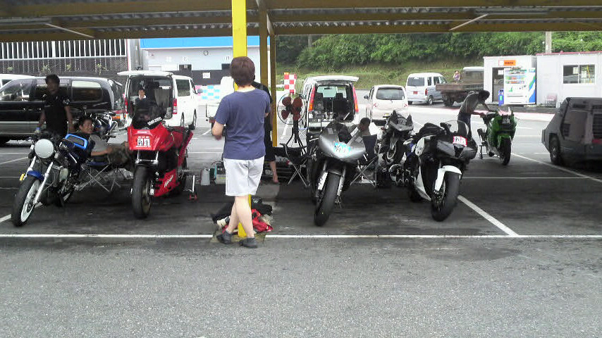 去年の暮れに忍者くんがサーキットデビューした時にサポートに来てくれてた某ガレージのボスが今日も来てくれてて、発電機でオバケ扇風機を回してくれてました。エラい快適でしたよ!いつもありがとうございます。