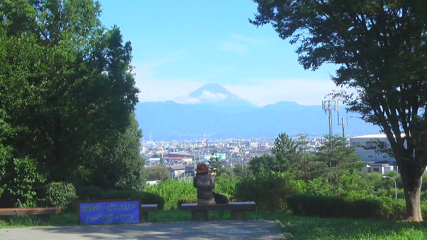何やら先客が居て、富士山に向かって設置してあるベンチで電話をしてる様子なんですけども、何となく絵になるなぁと思って写してみたら、シャッターが切れる瞬間に背中を掻いてて絵になりませんでした(笑)