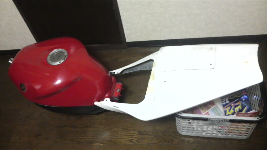実は1年以上前にヤフオクで激安で落札してたタンクと補修中のクレバーウルフのシングルシートカウル。
