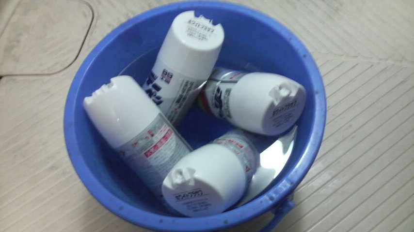 この時期缶スプレーは温めてやらないと仕事をサボるので50度くらいのお湯に突っ込んでおきましたよ。
