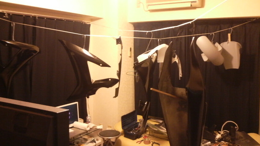 マンションでバイクを弄ったり補修したりって大変な面もありますけども、そもそも留めるトコがないっていう人もいるだろうし、そういう環境に住んでいる人が工夫してバイクに乗るように、ボクも創意工夫でカウルを塗るのです。