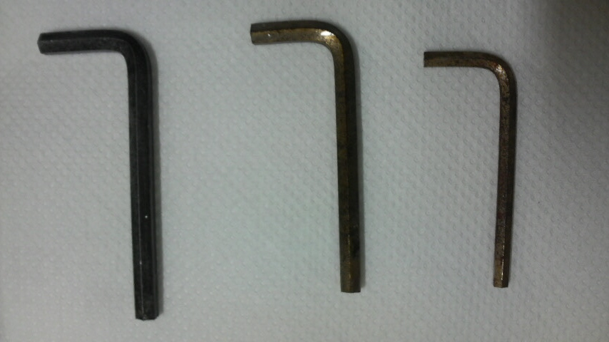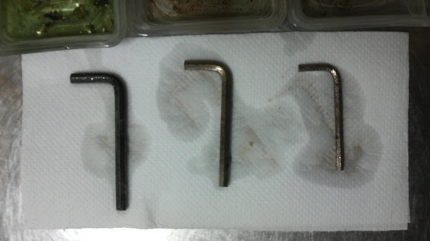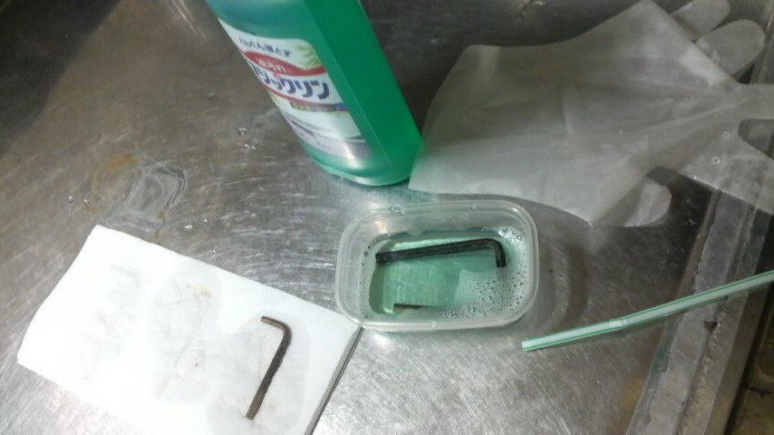 3倍と6倍の希釈液に漬けといて良い感じに表面の錆がなくなった2本のヘキサさんをすぐアルカリ洗剤☆ザ☆マジックリンでジャブジャブします。