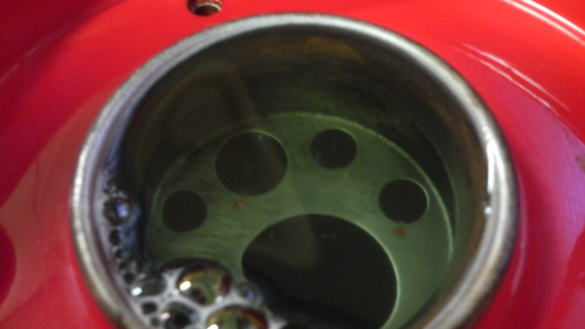 サビが酷かったのは給油口とその裏だったので、サンポールを投入する時はタンクを逆さまにして、ポンプ側から入れたんですけども、構造上淵切り一杯にするのが難しくて、『まぁなんとかなんだろう…』とか思ってたら、次の日の朝大変なコトになっていた!