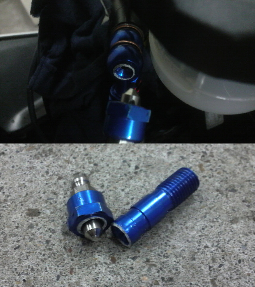 まったく利かないって訳でもないんでバイクと相談しながらゆっくり帰って来たんですけど、今日改めて明るいトコで見てみたらフロントのマスターシリンダー側のエアフリーバンジョーのガスケットの辺りから少しフルードが滲んでるようだったんで、もう少し増し締めしておこうと思ってですね、13mmのメガーヌでグイッと締めようとした訳ですけども、何とも奇跡的なタイミングで、それこそカトちゃんさながらなくしゃみが出てですね、『イッキシっ!』つって。
