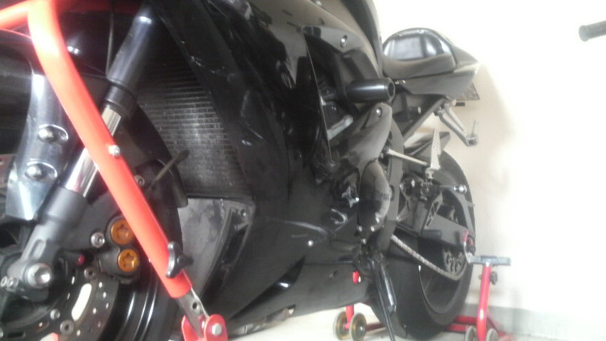 R1のスライダーは左右ともボルト一本でフレームとエンジンに共締めなので作業は一瞬!ジャジャーン!!