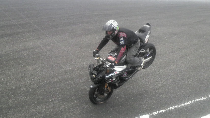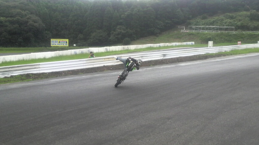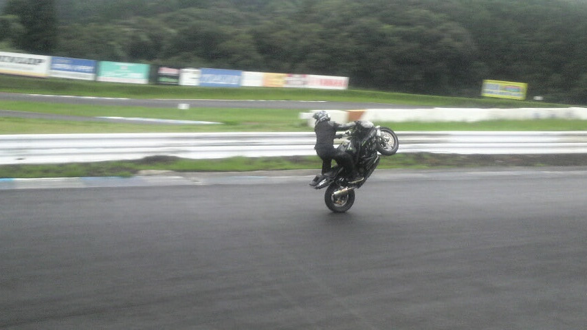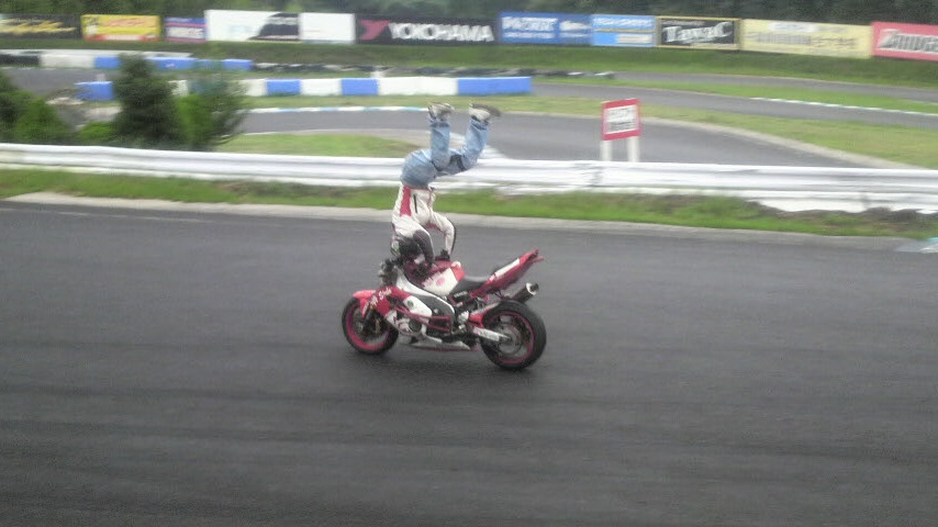 そのレースの後はエクストリームな人達がわんさか走ってて、何かの撮影みたいな感じだったんですけど、東コースでモトブレイクが4時に終了して、我々はダラダラウダウダと片付けをしてたので一番最後の方まで残ってたんですけども、そうこうしているうちに西コースで何やらやってたエクストリーマーが東コースのストレートで何やら始めた様子。