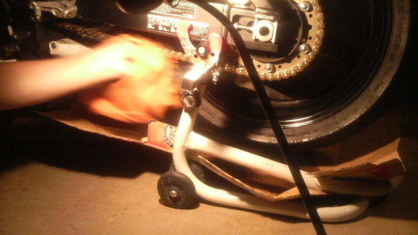 チェーンのメンテをマメにするという決意の現れ、J-TripのメンテスタンドにCBRを掛けて、粋な新聞紙の使い方とかクリーナーをどんな感じで吹くと効率的か?なんつぅ話しをしつつ、チェーンとかの駆動部のコンディションを最良に保つのがどんな風にサーキットのタイムに影響するか?とか、そんな話しを洗脳のように擦り込む。