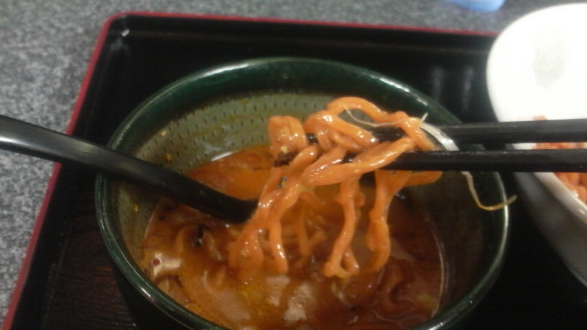 スープ自体がウマ辛ってのもあるんですけども、のすけさんお手製のオリジナル麺にも唐辛子が練り込んであるそうで、麺オレンジ色!