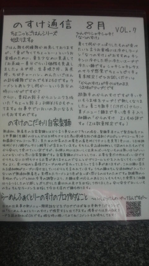ハットリを紹介してカウンターについて、メニューを取ってみるとその後ろにのすけ通信が。