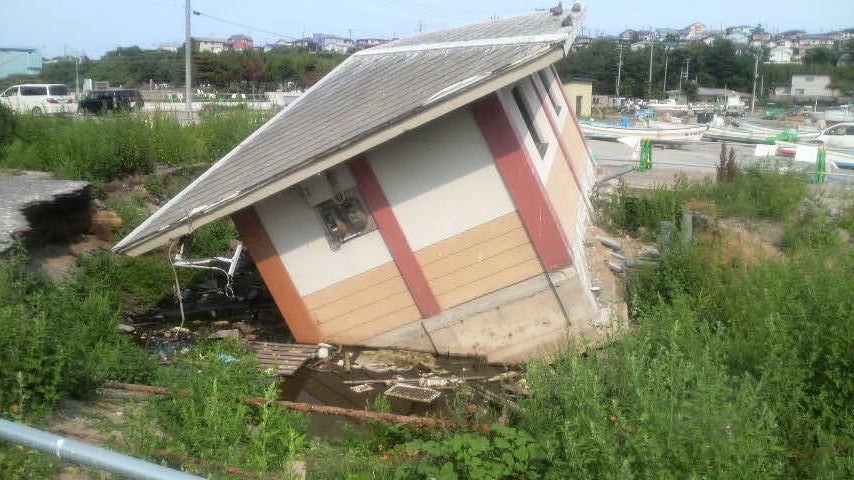 バイクを停めたすぐ脇の建物が津波の時に地盤が沈下したそうで、大変なコトになっていた。