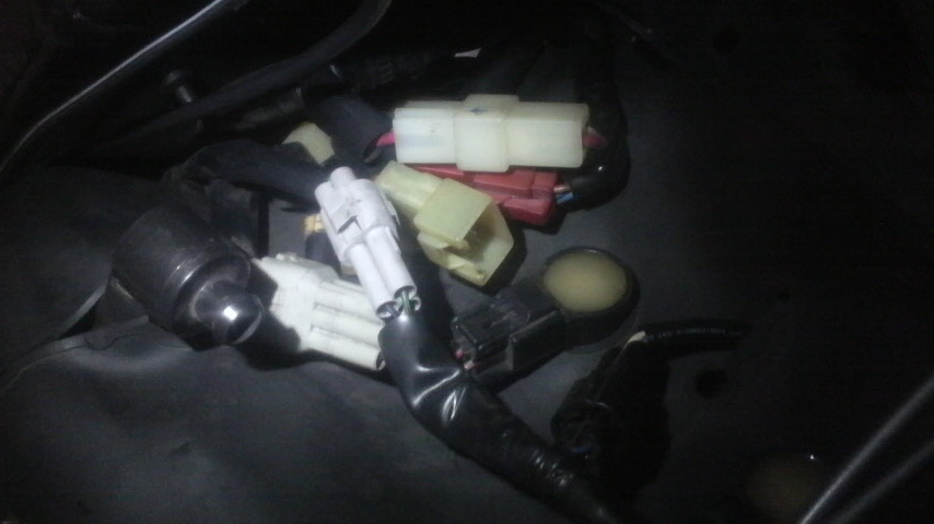 左のスイッチ以外は問題なく動作している点から考えて、左スイッチからのカプラーを外して接点復活剤でも吹いておこうと…夕方電気が着く前の薄暗い駐輪場でライトを当ててみる。