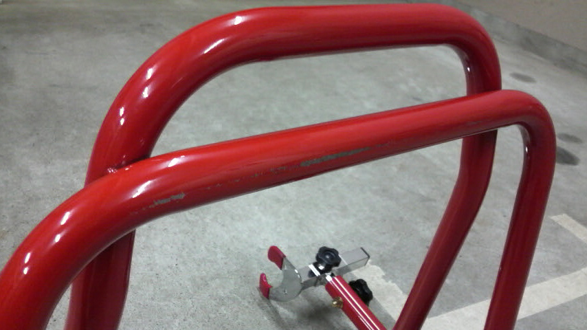 これはですね、サイトの動画にもある通り、女の子が鼻歌を鼻ずさみながらリフトアップ出来てしまうほどに力がいらないんですけども、デモの動画のようにフックを掛けたあと足で踏んでリフトアップするとガコン!ってスタンドの後方のパイプが叩き付けられるんですよね。