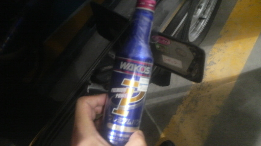 で、いろいろやってダボくんちのちびっ子、ミニダボくんに少し遊んでもらって帰りに納車された日から2度目の給油をしたんですけども、なんだかんだと13万キロ走ってる車なので、ちょっと労ってやろうと思ってワコースのプレミアムパワーを投入。