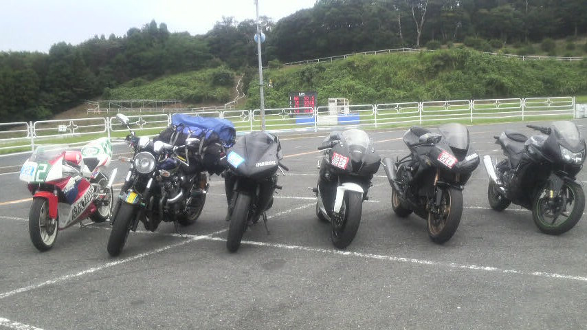左からtarawoさんのNSR、トモ松さんfrom青森のXJR1300、僕のR1、ダボくんのCBR600RR、ハットリのZX10R、茂原デビューの小忍者エヌノハラのNinja250R。