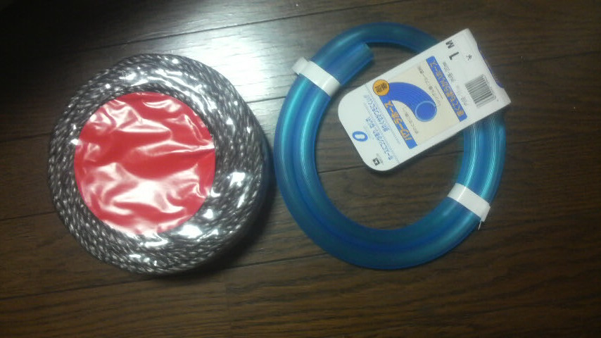 そんで代わりに近所のDIYなお店で買って来た数百円の水道ホースと紐。