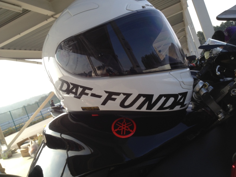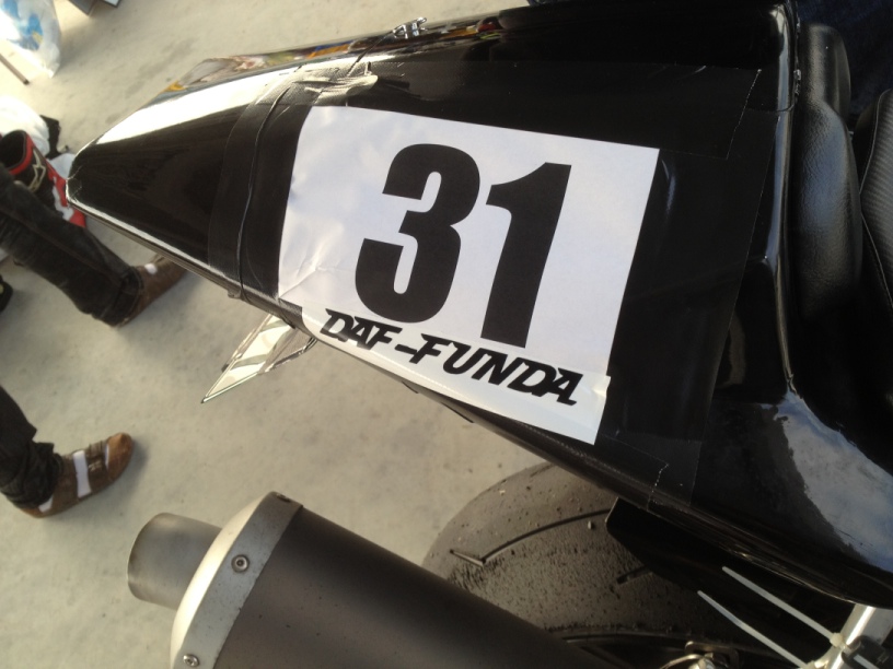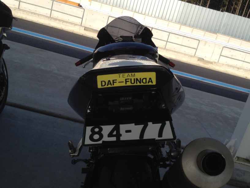2人で浮かれて大騒ぎしながらゲートをくぐって、パドックエリアの入り口でゼッケンナンバーとチーム名を聞かれたので『ゼッケン31です』と伝えると、用紙を見ていたスタッフの人がTeam DAF-FUNDAというのを見て『えっと…』と言ってるので、『チームだっふんだです』と伝えると、『だっふんだ!プフー!!(笑)』とマンガみたいに笑われました。