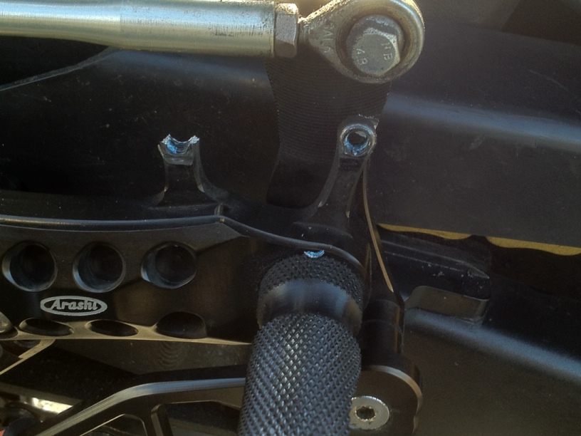 ここ暫くシフトペダルの噛み合わせが悪いなっていうか、遊びが有り得ない程出て来てて、ペダルを外してみてみたら軸受けがヤレて来てガバガバっていうか、ネジロック剤を併用してかなりのトルクで締め込んでも固定不可能になっていたので、どっちにしてももうそろそろだなぁ…と思っていたら、ヒールプレートのステーがバリっと割れた。
