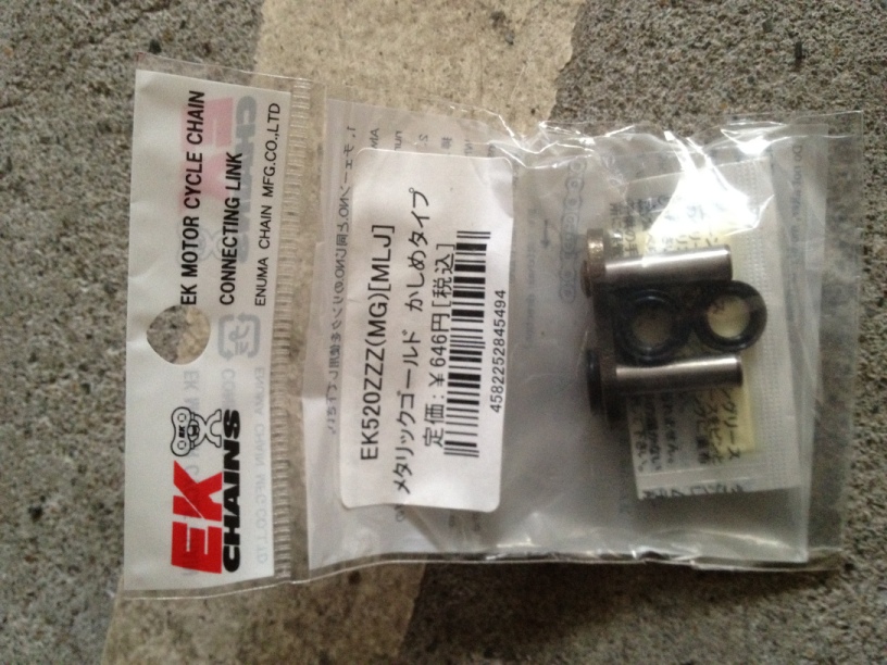いくらなんでもこれではどうにもならないのでチェーンを詰めないといけないんですけども、僕が着けてるEKの520ZZZっていうかしめのパーツってその辺のパーツショップで探したら何処にも置いてなくて、結局webikeで取り寄せるコトにした。