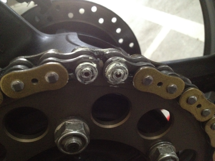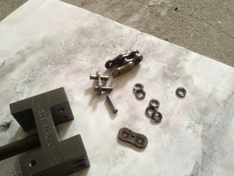 純正のピンを抜く時は、ピンの頭をヤスリで落としてからじゃないとツールが壊れてしまいそうな程だったけど、このチェーンはサイズのせいだからか材質のせいだからか、頭の処理をしないでも普通に抜けたので楽だったけどf(^_^;)