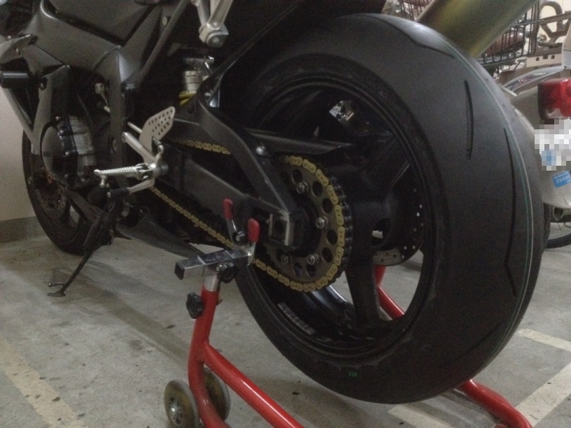 で、チェーンを繋いで、リアを2丁ロングの状態でチェーンの張りを調整したら、もう1度タイヤを外してスピードスターに電話。