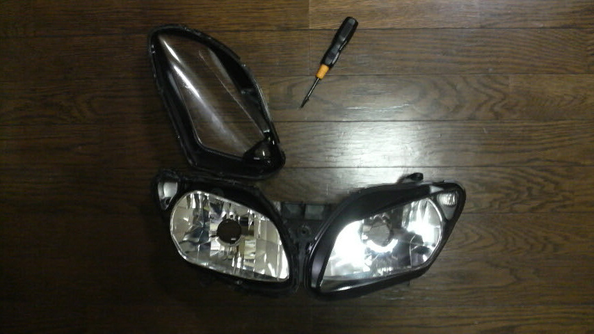 タイヤは山が残ってればDIABLO SUPERCORSAで車検通るっていう話しを聞いたんで、このまま今月サーキット行かないで温存しとけばなんとかなるかなっていうトコなんですけども、左のヘッドライトは端のポジションランプが点いてる部分が割れてヒビが入ってんですよね…。