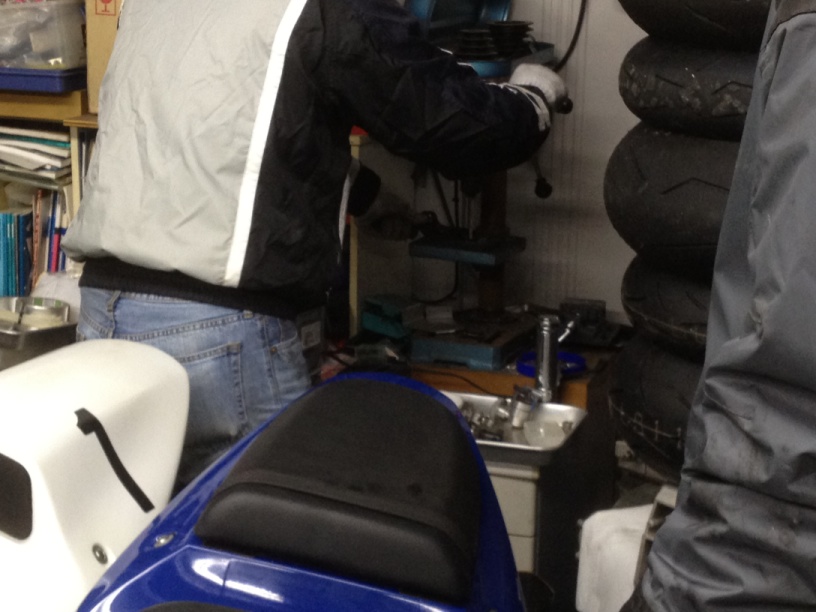 12日のモトブレイクでほりっく部長が乗る予定のRに新品タイヤを履かせるフクドナルド監督。