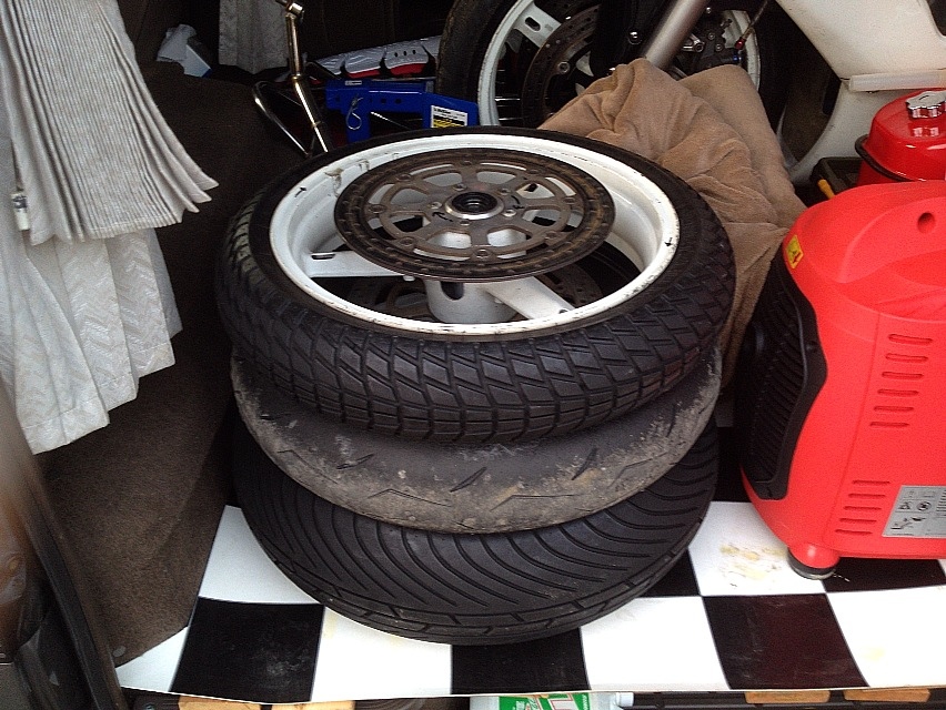 そんなこんなで借り物のGSX-Rの、更に借り物のスペアホイールにレインタイヤを装備。