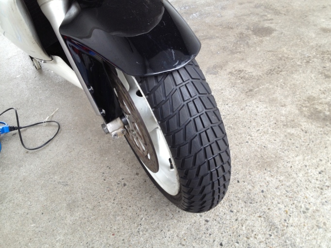 中古タイヤで、ヒビとかはないし山もバリ山。ただ表面が固いのが気になるっていう感じだったのだけども、ウォーマーを巻いて熱を入れた後で触ってみたら、練り消しみたいな感じになった♪