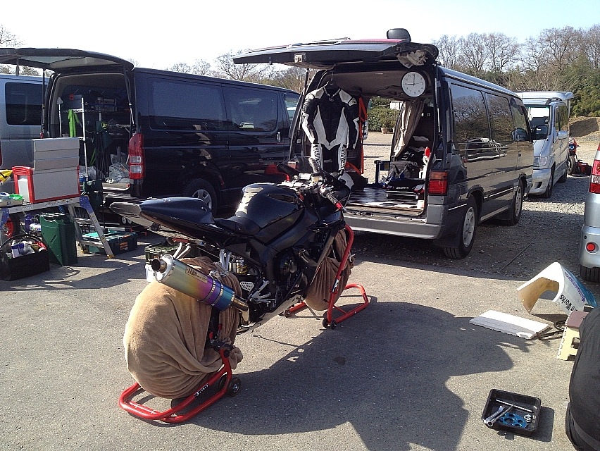 日曜の夜、ここ暫くレースに出るために借りていたGSX-R600を監督のガレージに降ろして、代わりに自分のR1を積んで来た。