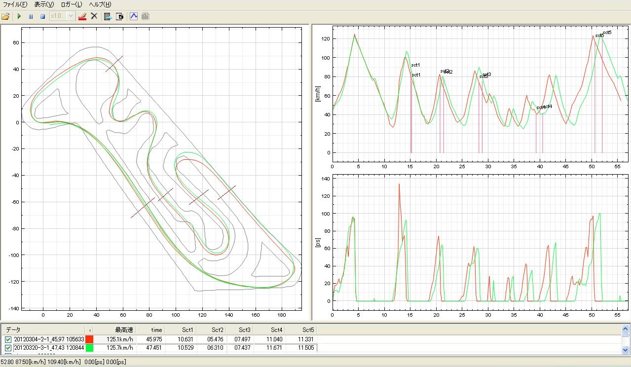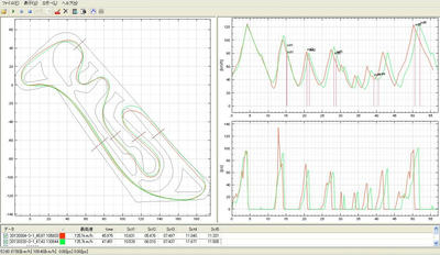 赤いラインがGSX-R600で45秒9、緑のラインが今日のR1で47秒4。