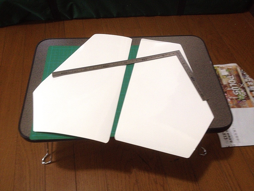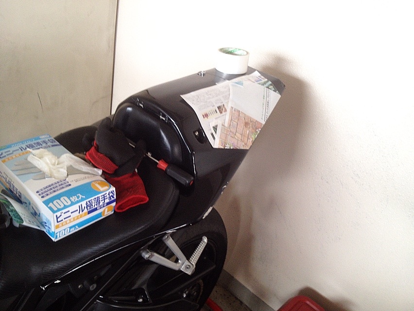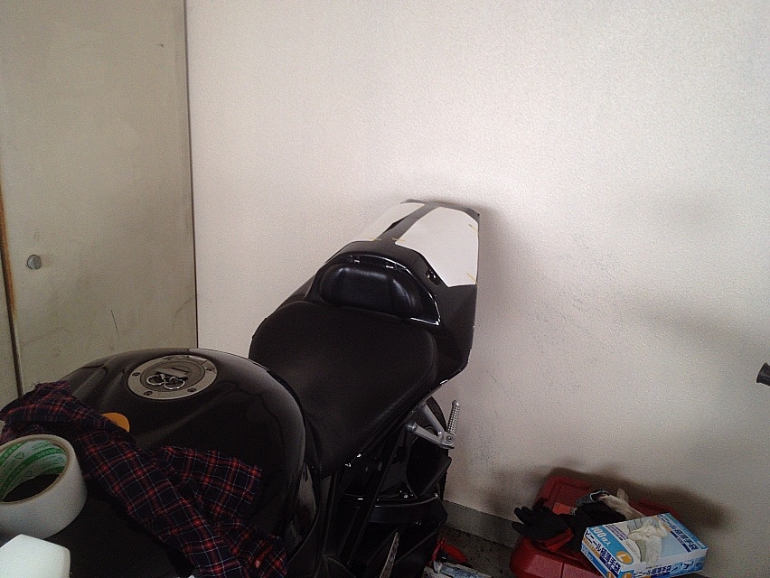 それと、カウル補修時のテヌッキーで黒一色になった我がR1に、ヤフオクで買ったフルカウルを乗せてみたら前ばかり白が増えて何となく違和感があったので、後ろにも白を足しましょうよってコトで、カッティングシートでそれとなくベースを作るコトにする。
