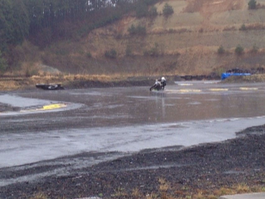あれ以来レインコンディションには心が折れているというか、『自分は雨が降ったらおしまいだ…orz』と思っていたのだけど、コースインする寸前に『ブレーキだけ気をつければ問題ないよ』と『ウォーマーで暖まってる始めの数周の方がイケんじゃね!?』というタラヲさんの言葉にすっかりマインド・コントロールを受けて、『なるほど…たった今目の前で見たレインコンディションでも膝を当てて走る人がそう言ってるし、実際目の前で大丈夫なのを見たしな♪』と思ってコースイン。