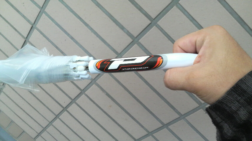玄関付近の傘やらチャリンコの空気入れやらを放置してあるトコの近くに工具やらケミカル類やらも放置してて、ちょっと前にグリップを交換した時に入ってたステッカーが転がっていて、他にもちょっと探したら出て来たステッカーのうち、ハイスロについてきたantlionのステッカーが形と大きさ的に丁度良さそうだったんでどっちか貼ってこうと思い、グリップ繋がりってコトでPROGRIPのステッカー。傘のグリップにゲルなんか入ってたら最高なんだけどなぁ♪
