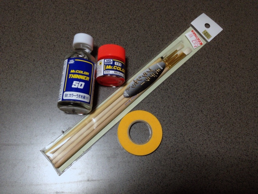 蛍光レッドのプラカラーとうすめ液、筆のセットとマスキングテープですね。