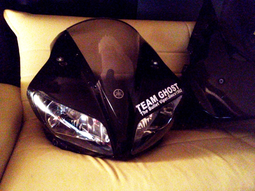 そのせいで自分のR1がそこにあるような錯覚を起こすし、普段生活してる部屋に入ると筑波の練習対策で外されたノーマルの顔がソファーにドドンと置いてある。