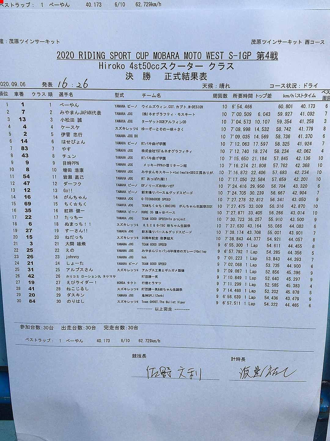 21番手スタートして…1~3コーナーで揉まれてちょっと順位下げて…2台抜いて1台抜き返されて…そのままゴールして…出走30台中30位!